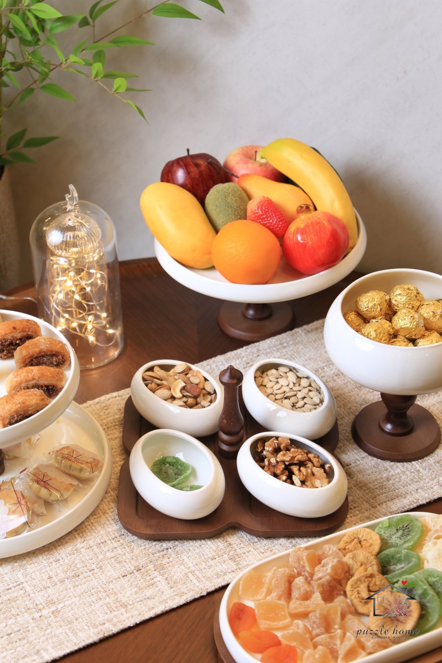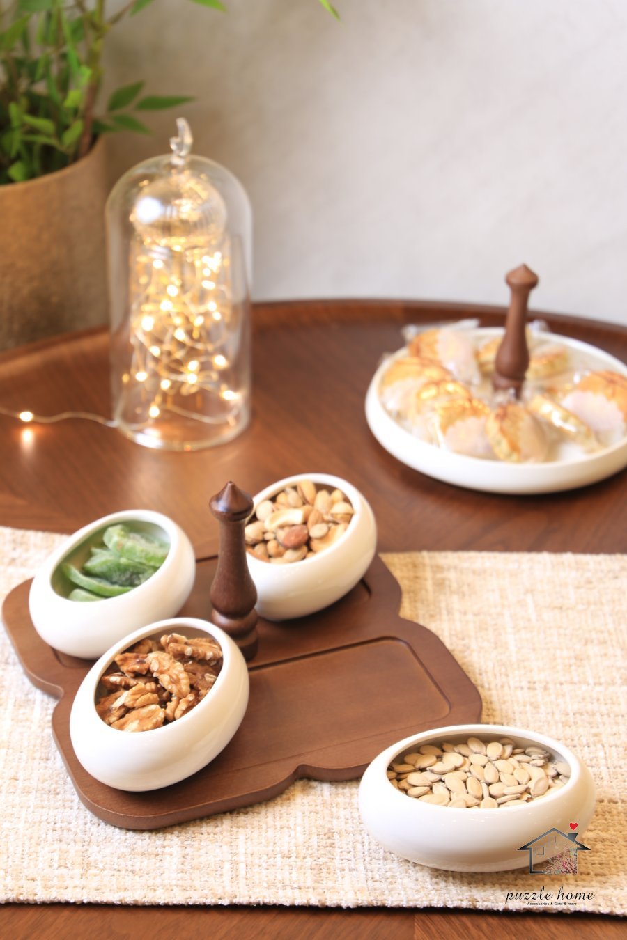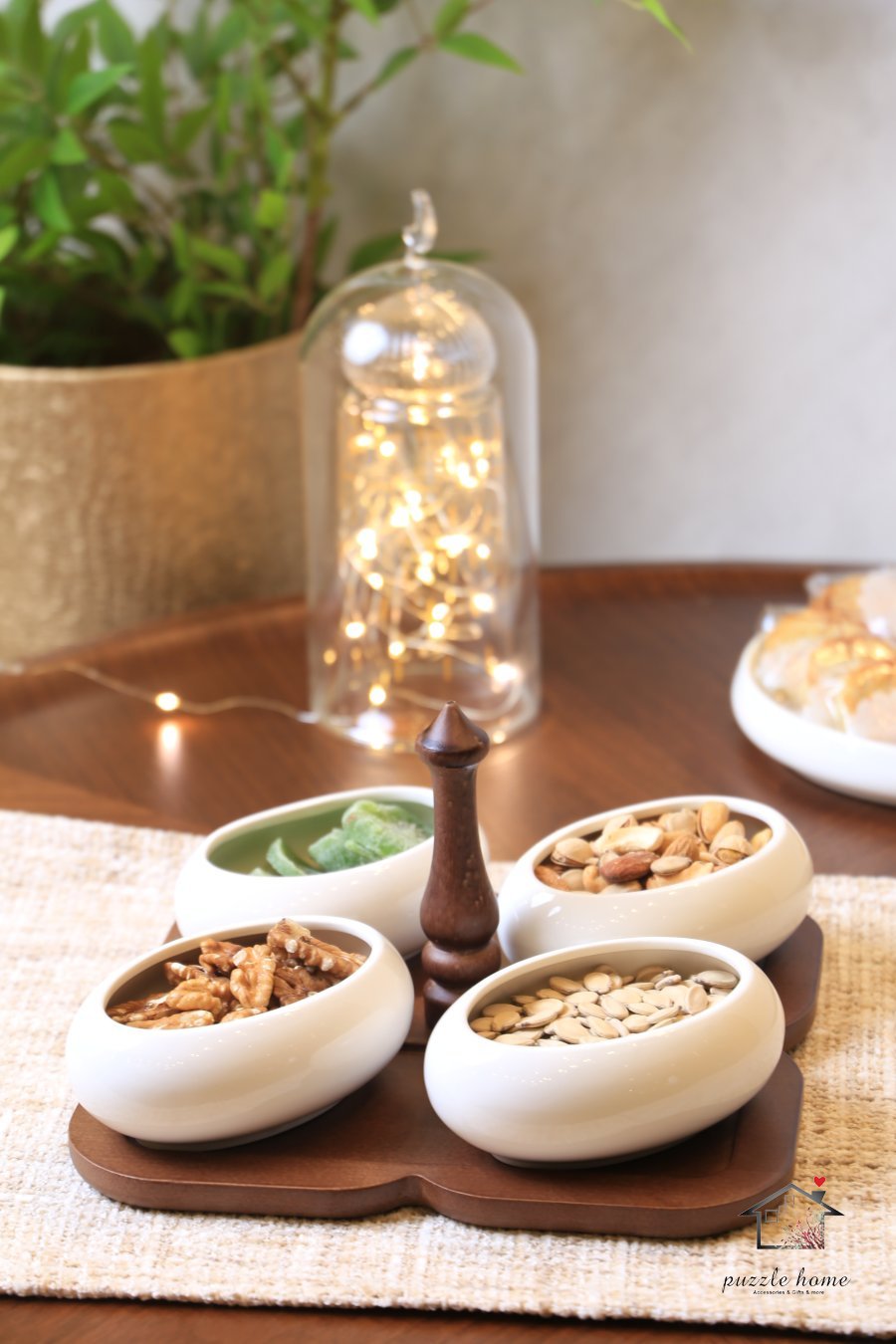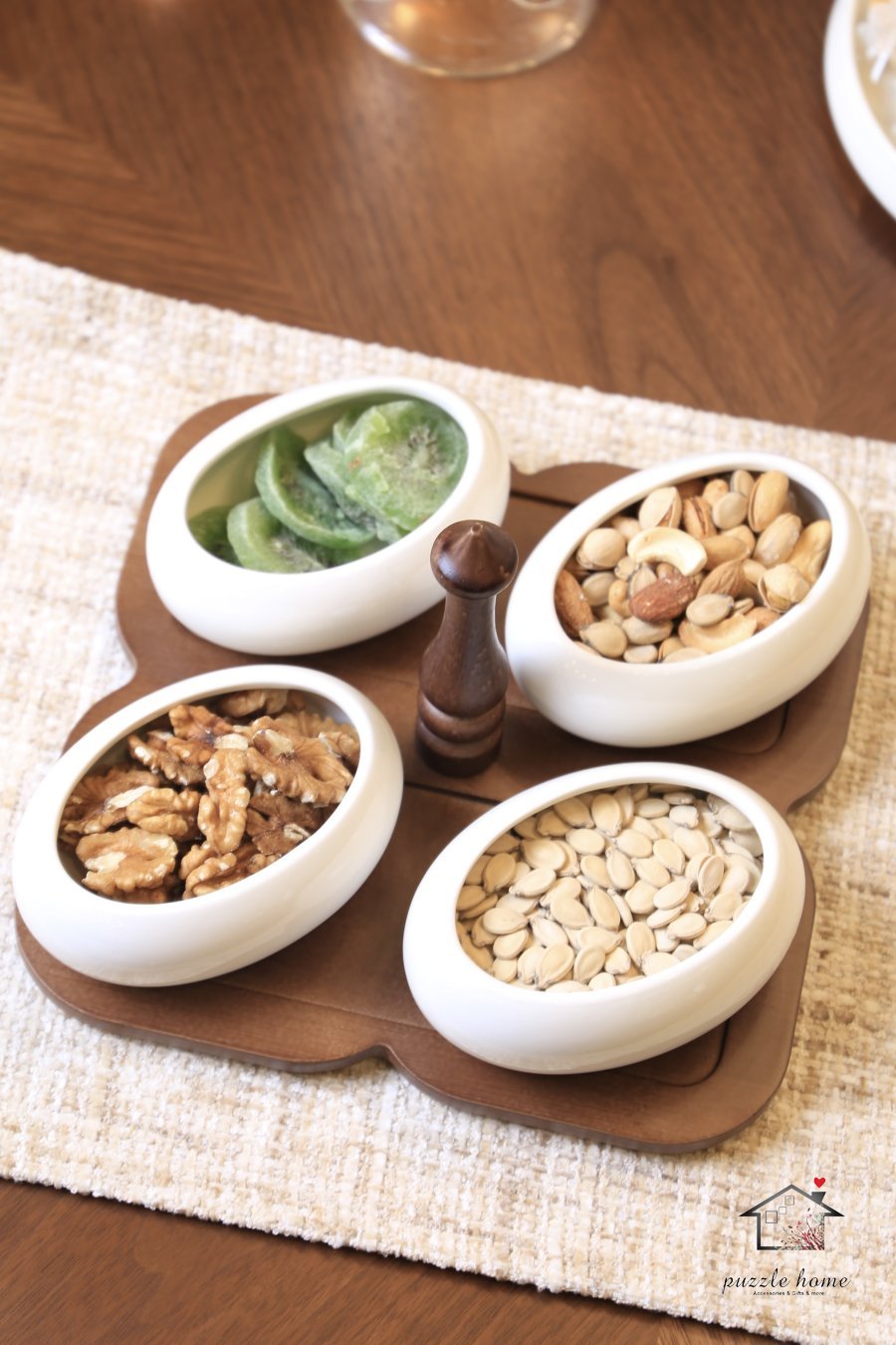 طقم مضيفة خشب مربع مع 4صحون بيضاوي بورسلان ابيض