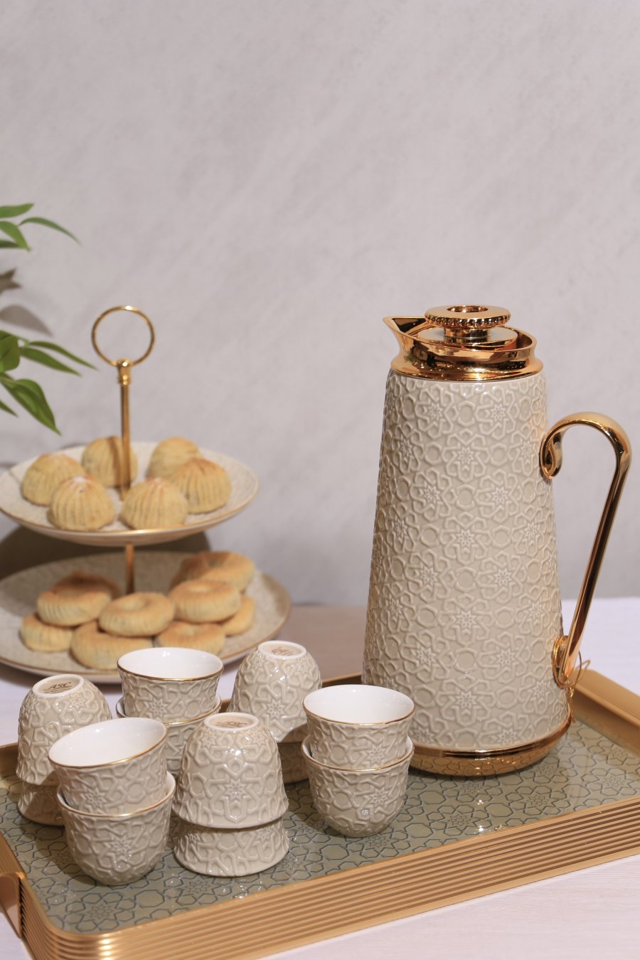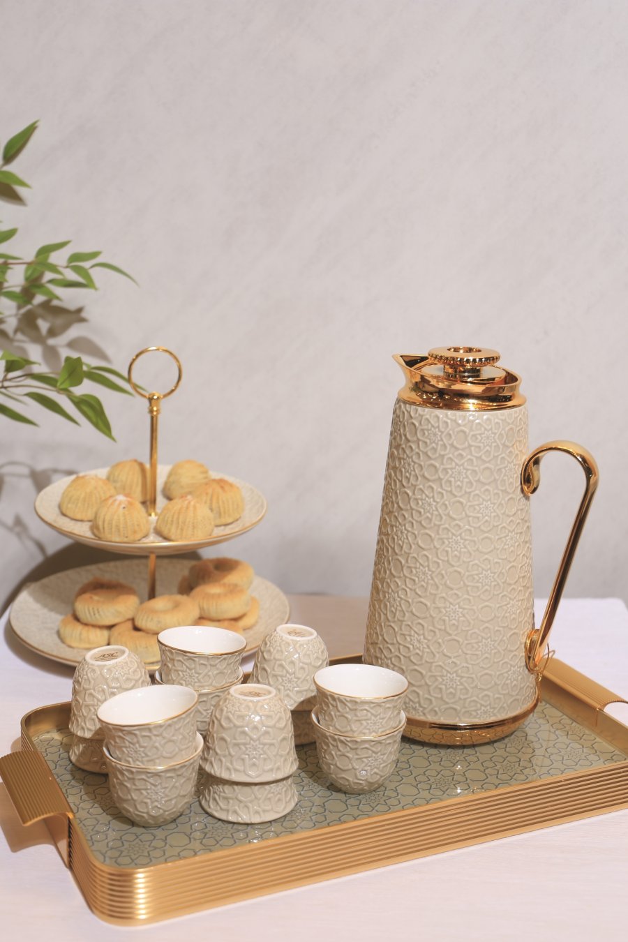 طقم دلة مع فناجين قهوة سادة بورسلان وصينية زجاج